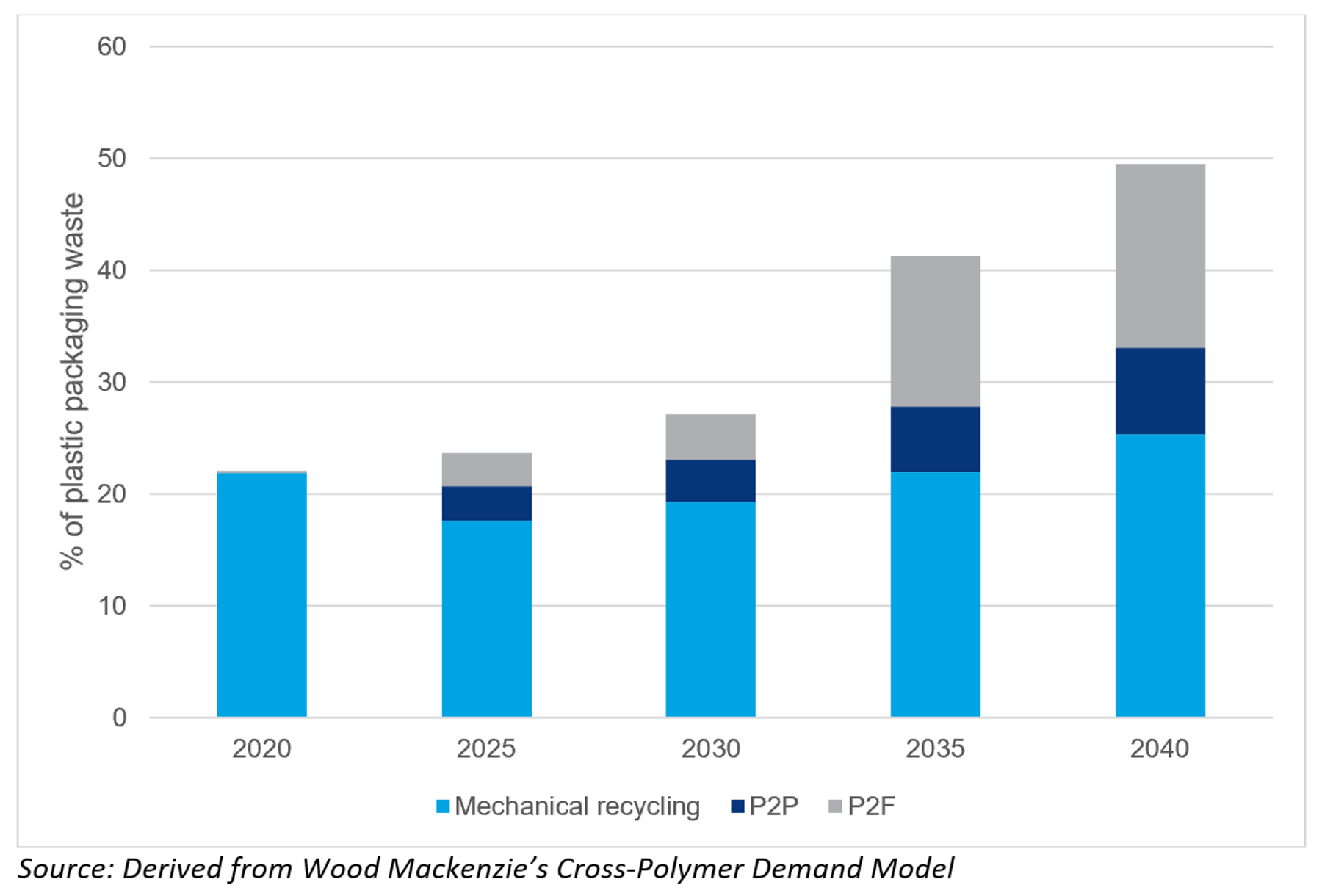 - Investment: to achieve a recycling rate of 25% of plastic packaging, Wood Mackenzie calculates that $50 billion of investment will be required by 2040 to deliver enough chemical recycling capacities.