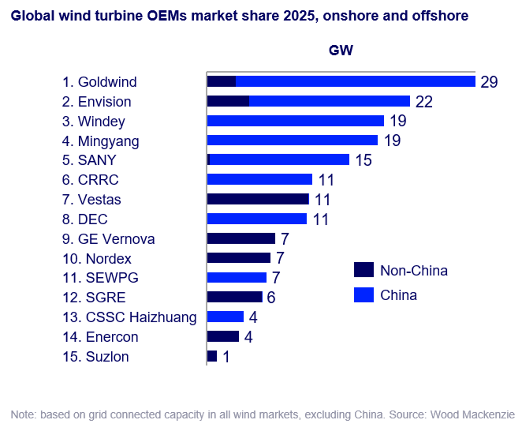 Goldwind and Envision led the pack. For the first time, two turbine manufacturers exceeded 20 GW of installations. Their momentum reflects a strategic model rooted in scale, competitive pricing and rapid deployment. China's substantial domestic buildout and expanding presence in emerging markets support this approach.
