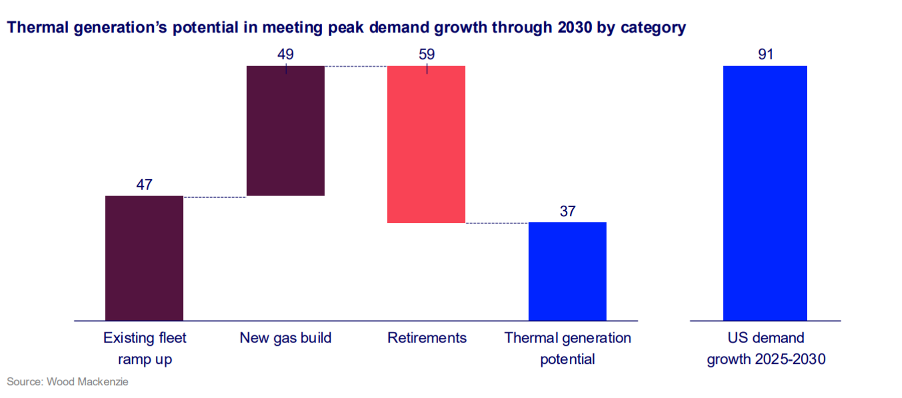 With the US preparing for approximately 90 gigawatts (GW) of peak demand growth through 2030, gas and coal generation will only be able to meet about 37 GW of this growth, according to a new report from Wood Mackenzie.