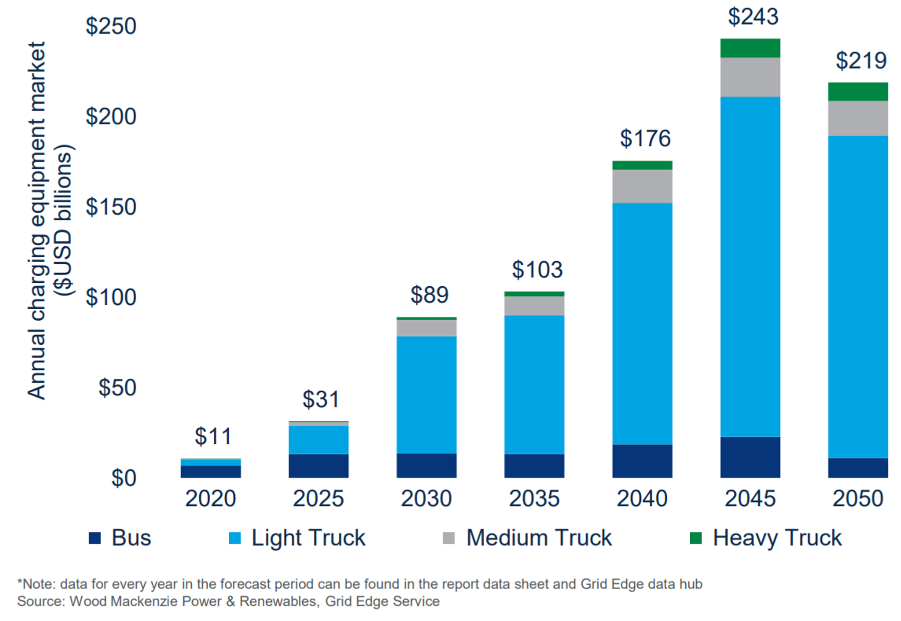 This policy support will see the annual market value of electric bus and truck charging outlets pass the $200 billion mark by 2045, according to Wood Mackenzie.