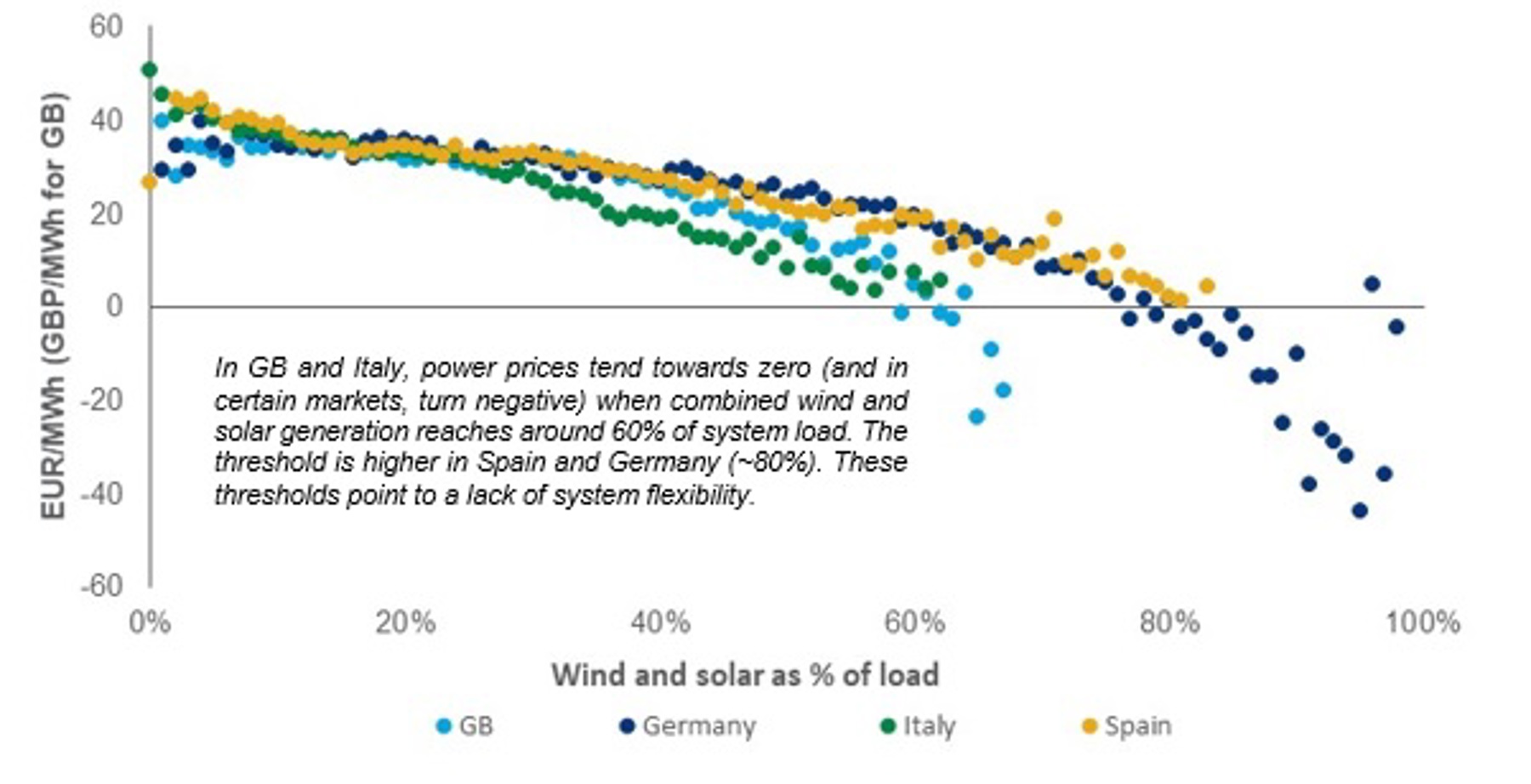 “However, despite this, Europe will continue to possess proportionally more variable renewable energy (VRE; wind and solar) than any other region on the planet. While delivering low-cost, low-carbon power in abundance, the non-dispatchable nature of VRE presents a flexibility challenge for power systems. Particularly over the 2020 coronavirus lockdown months, we witnessed the impact of high VRE on the system, resulting in low and negative power prices. This points to a lack of system flexibility.