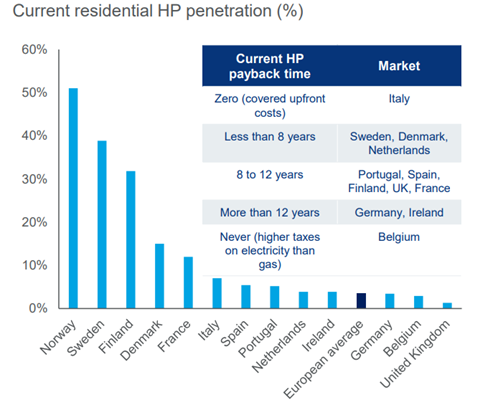 In comparison, Norway leads the way with early adoption triggered after the 1970s oil crisis. The country embraced heat pumps, fuelled by government subsidies, high fossil fuel taxes, low electricity prices and restrictions on oil boilers, which have been banned since 2020.
