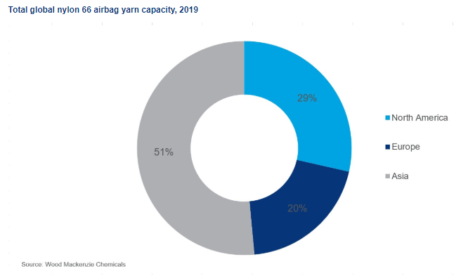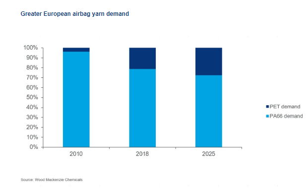 “Nylon 66 prices have consequently escalated rapidly. An accelerated switch to polyester has been avoided since airbag modules cannot easily be changed once specified by new car models. PA 66 raw material shortages have eased slightly in recent months as global automotive demand has softened, while prices remain high. If PA 66 can defend itself until the new Invista ADN plant opens in Shanghai in 2022, it may avert a structural acceleration in the shift to polyester,” said Mr. Hart.