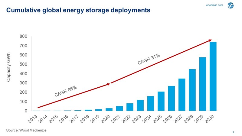 Wood Mackenzie’s latest report shows global energy storage capacity could grow at a compound annual growth rate (CAGR) of 31%, recording 741 gigawatt-hours (GWh) of cumulative capacity by 2030.