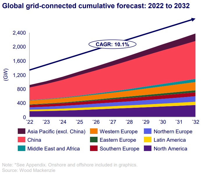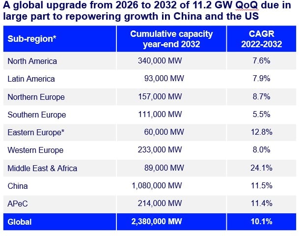 Increased activity in Western markets and Africa will drive a ten-year compound annual growth rate of 10.1% for grid-connected wind power, leading to 2.38 terawatts (TW) of cumulative installed capacity at the end of 2032, according to Wood Mackenzie.