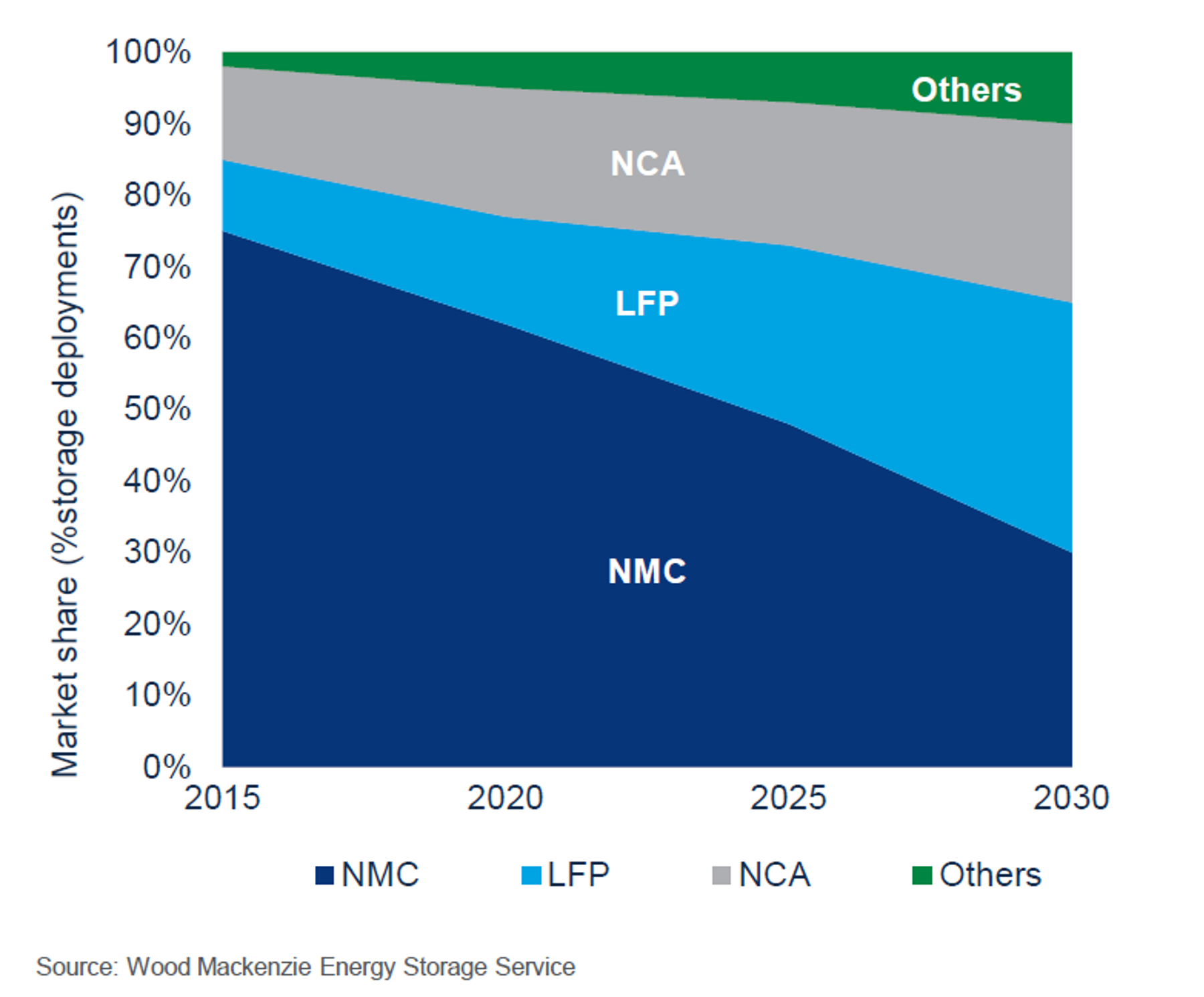 Lithium-iron-phosphate (LFP) is poised to overtake lithium-manganese-cobalt-oxide (NMC) as the dominant stationary storage chemistry within the decade, growing from 10% of the market in 2015 to more than 30% in 2030, according to new analysis from Wood Mackenzie.