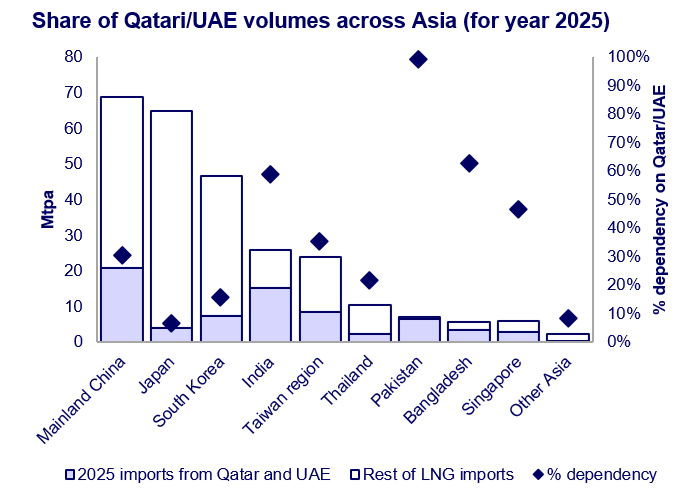 The closure has removed 1.5 million tonnes (Mt) per week (2.2 bcm) from global LNG supply, equivalent to 19% of global exports. With around 90% of LNG exports from Qatar and the UAE destined for Asia, the region is most exposed to the disruption.