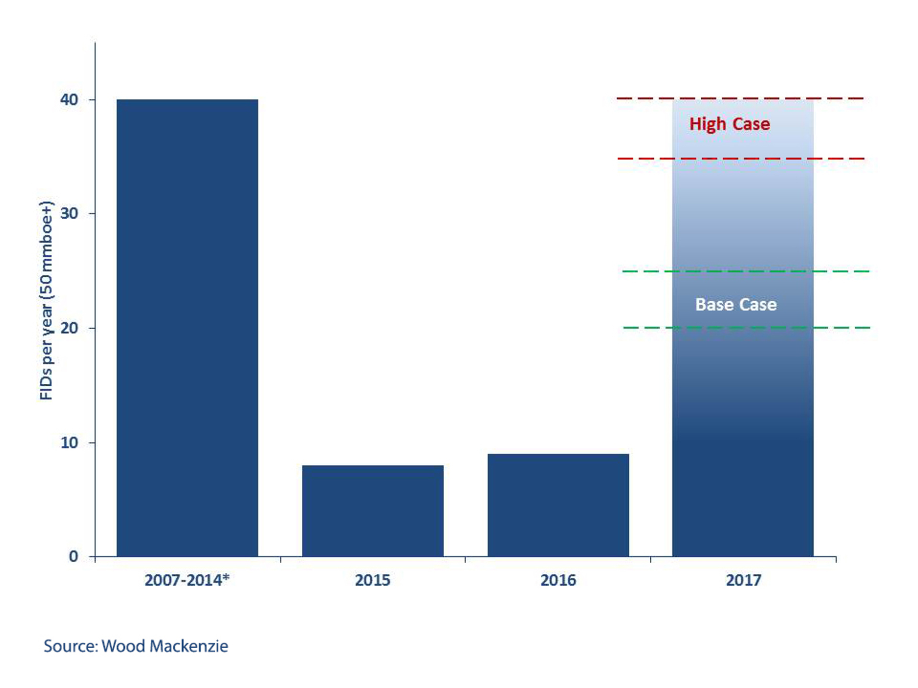 LONDON/HOUSTON/SINGAPORE, 11 January 2017 — Wood Mackenzie forecasts the investment cycle will show the first signs of growth in 2017 since 2014 and final investment decisions (FIDs) will double, compared with 2016.