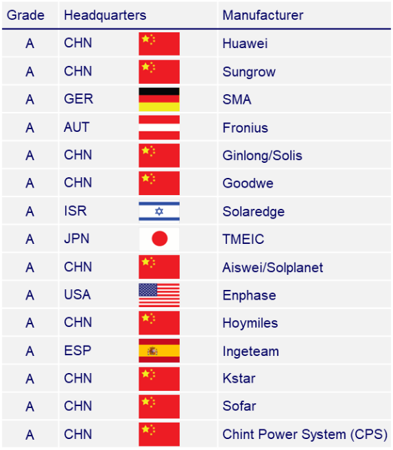 Grade A is awarded to manufacturers that meet Wood Mackenzie’s benchmark for industry best practice, demonstrating consistent and verifiable performance across the key criteria assessed in this ranking. To achieve Grade A status, a manufacturer must meet at least five of the defined benchmarks, reflecting a level of capability that helps reduce execution and operational risk for developers, EPCs and asset owners.