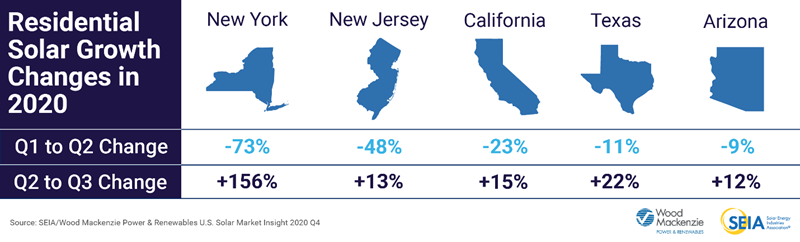 “Logically, the states with the biggest installation declines in Q2 also had the biggest recoveries in Q3, such as New York and New Jersey where restrictions were substantial,” said Michelle Davis, senior analyst at Wood Mackenzie. “Business model adaptations, such as virtual sales tactics and pricing promotions, continued to pay dividends through the summer and fall.”
