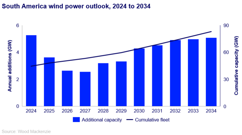 Onshore wind capacity in South America will hit 83 gigawatts (GW) by 2034 with a 6.5% annual growth rate, a report from Wood Mackenzie finds. Top three markets account for 84% of the 39 GW regional outlook.