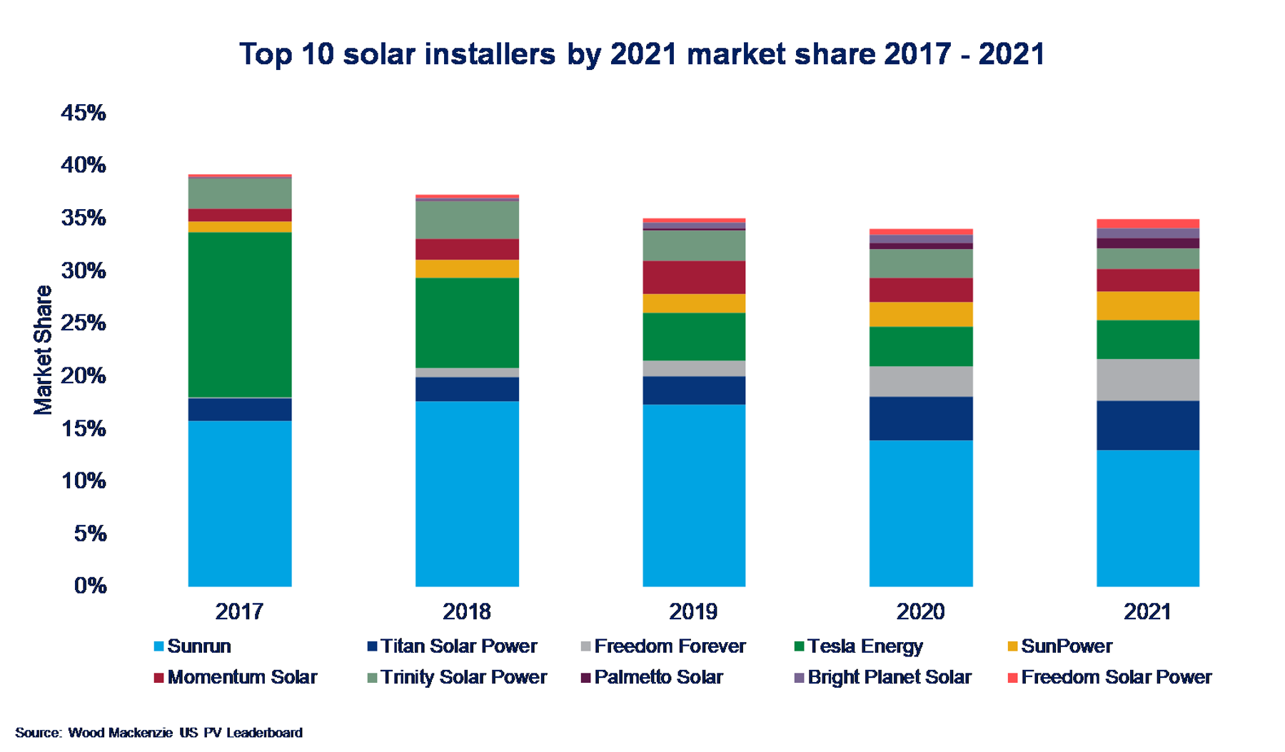 Together, Sunrun, Titan Solar Power, and Freedom Forever command over 20% of the US solar residential market.