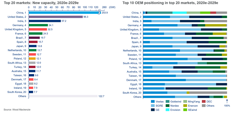 The top three wind turbine players - Vestas, SGRE and GE - will increase their combined global market share from 43% in 2019 to 60% by 2029, according to new research from Wood Mackenzie.