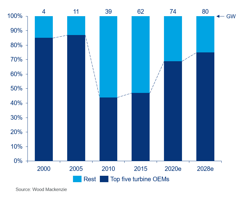 After a decade of fragmentation, the top five global turbine OEMs are strengthening their hold on the industry. By 2028, they are expected to control three quarters of the sector.