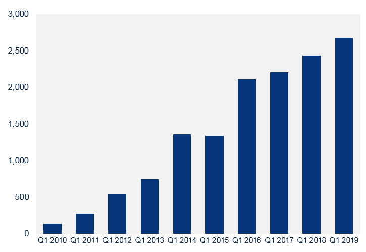 FIGURE: U.S. PV capacity installed in the first quarter, Q1 2010 – Q1 2019 (MWdc)