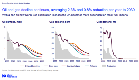 - North Sea exploration ban locks in import dependence; domestic oil production falls to 79% of 2025 levels by 2035, gas to 40%; net imports reach 0.6 million bpd oil and 39 bcm gas