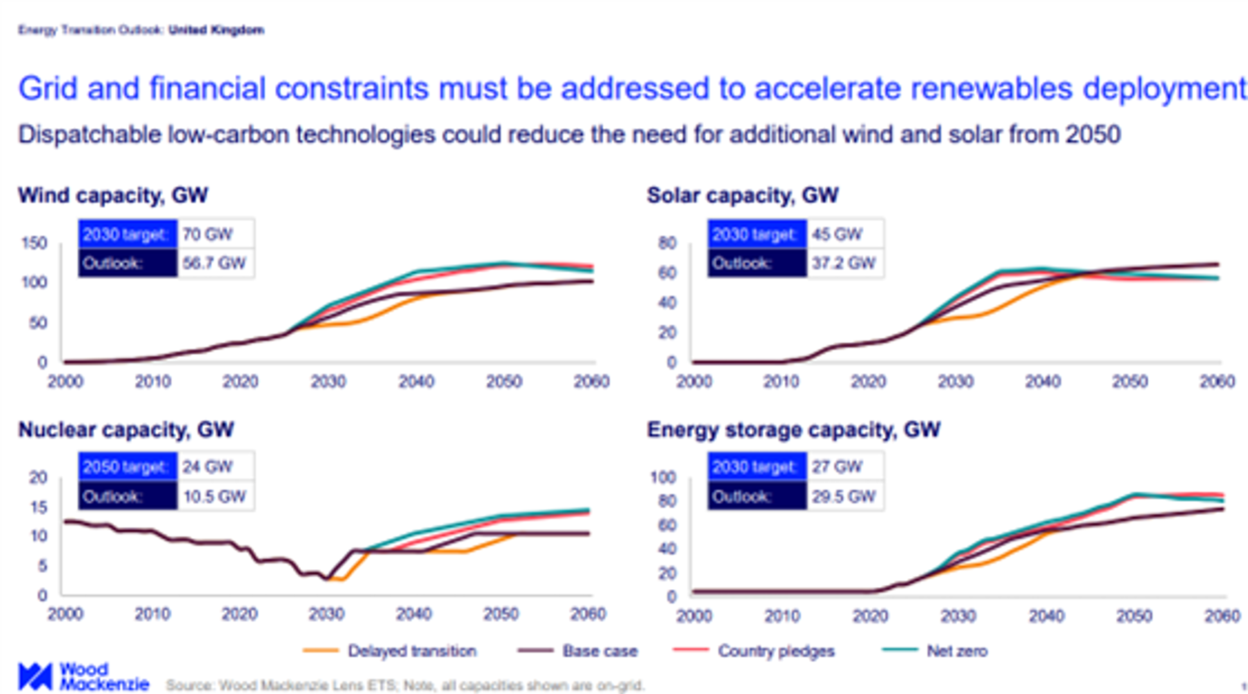Technology priorities are evolving. The government selected Rolls-Royce for a small modular reactor pilot project, with Wood Mackenzie expecting first grid-connected SMR generation in the early 2040s. An AI Growth Zone will collocate data centres with SMRs, though data centres reach less than 2% of total power demand by 2030 in the base case. Nuclear capacity hits 10.5 GW by 2050 in the base case, well short of the 24 GW government target.