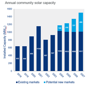 The US community solar market will continue to grow over the next five years, with at least 7 gigawatts direct current (GWdc) of community solar expected to come online in existing markets between 2022-2027.