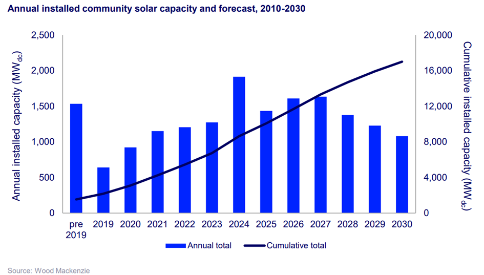 As of the end of 2025, cumulative community solar installations total 10.1 GWdc. Wood Mackenzie has developed high-case and low-case scenarios to capture market uncertainties: