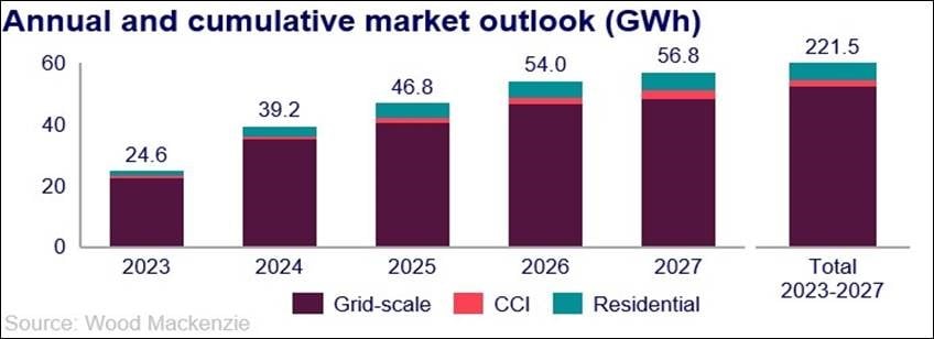Wood Mackenzie projects the grid-scale segment to be the main driver of the market in its five-year forecast from 2023-2027, accounting for 83% of total installations, or 55 gigawatts (GW).