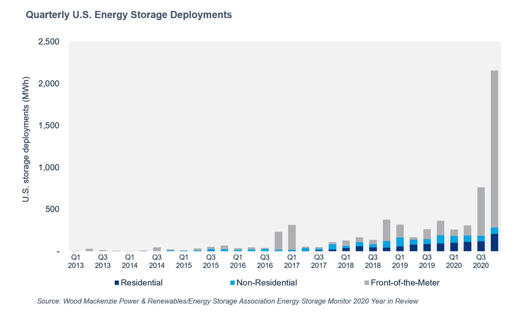 According to Wood Mackenzie and the U.S. Energy Storage Association’s (ESA) latest ‘US Energy Storage Monitor’ report, 2,156 megawatt-hours (MWh) of new energy storage systems were brought online in Q4 2020. This is an increase of 182% from Q3 2020, making Q4 the new record quarter for U.S. storage.
