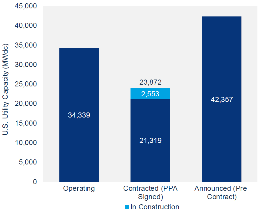 - After the uncertainty of the Section 201 tariffs passed, 13.2 GWdc of utility solar PPAs were signed in 2018, though mostly with expected commercial operations dates in years after the tariffs have stepped down. The contracted pipeline peaked in Q3 2018 at 25.3 GWdc, the highest in the history of U.S. solar.