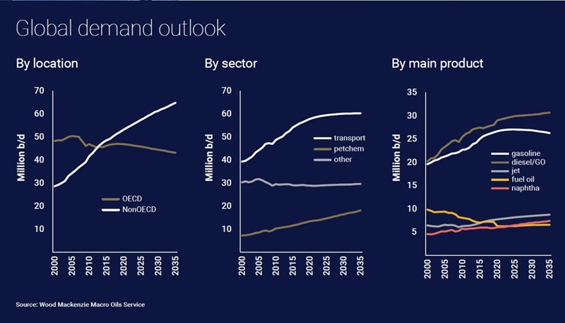 In contrast, Wood Mackenzie expects demand in non-OECD economies to grow by nearly 16 million b/d by 2035, due in part to rising income levels and a growing middle class boosting demand for transport fuel. On top of this, demand for consumer goods, including plastics, and the need to move freight in an increasingly consumer-driven world, will also contribute to non-OECD oil demand. Non-OECD demand growth slows from 2030, driven by a stall in oil demand growth in China.