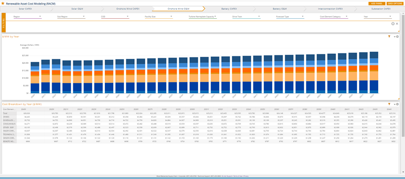 • Generate cost buildups, forecasts, and impacts for any contemplated solar, onshore wind, or battery storage.