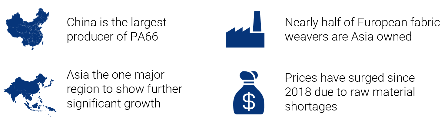 Adiponitrile (ADN) is an essential component of PA66 but has been in short supply (all four dominant ADN producers suffered force majeure events in 2017/18). Huge investment to combat this includes new production plants, with the major focus in China and could lead to increased rationalisation for yarn suppliers and weavers. As the first of these ADN plants becomes active, we expect suppliers to begin efforts at locking in their customers, signing longer-term contracts at attractive prices.