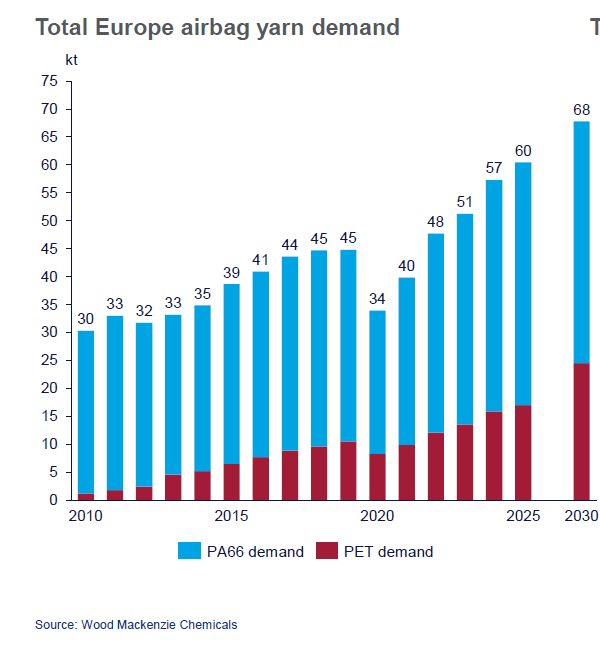 At half the cost of nylon, there have been efforts to introduce polyester yarns in every nylon industrial market and there its use in airbags has been steadily growing. Changes to raw material prices and concerns over supply shortages, coupled with module assemblers becoming more accustomed to the new components required for polyester airbags, mean that the airbag industry is now expected to push harder for further polyester substitution for nylon that was previously thought.