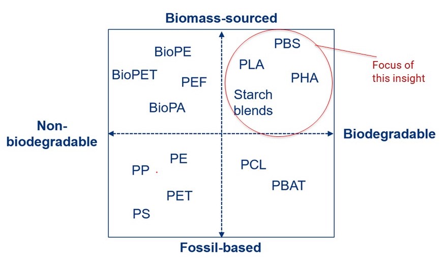 This report focuses on polymers which are both biodegradable and bio-sourced: polylactic acid (PLA); starch polymers or blends; poly(hydroxyalkonates) (PHA); and poly(butylene succinate) (PBS).