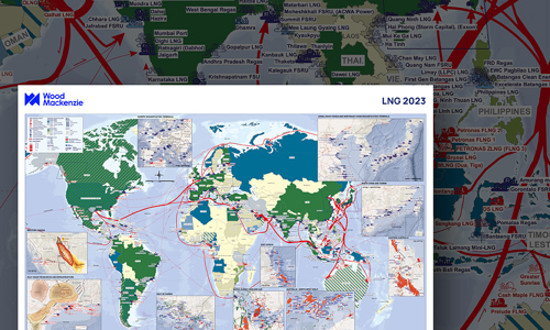 Our highly detailed Global LNG wallmap, showing LNG shipping routes, and liquefaction and regasification terminals and their project status.