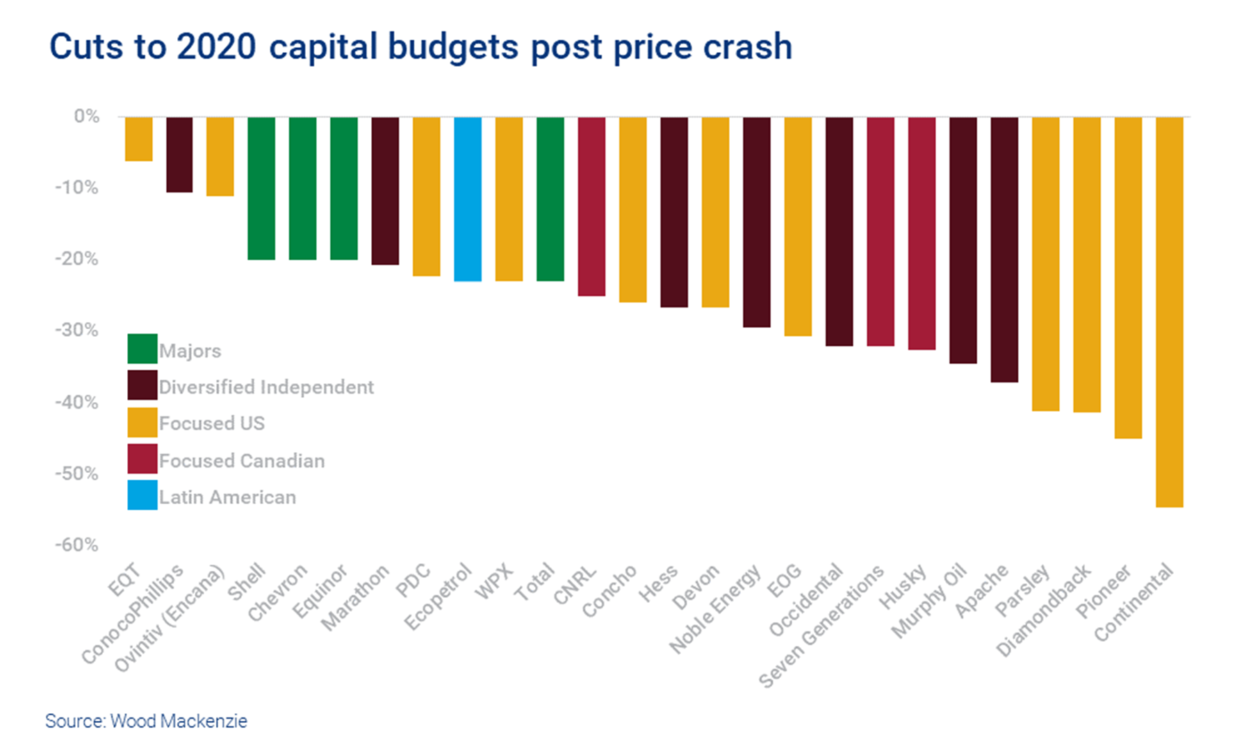 This graphic underlines the scale of the spending cuts being made across the oil and gas industry in the past few weeks. It comes from an opinion column by Andy Tidey, Wood Mackenzie’s head of performance improvement, and shows the percentage cuts in capital spending announced by leading companies since the oil price crash in March. It is worth reading in conjunction with another piece of Wood Mackenzie research, showing that US$110 billion worth of potential investment previously scheduled to go ahead this year will now almost certainly be deferred, with another US$100 billion at risk.
