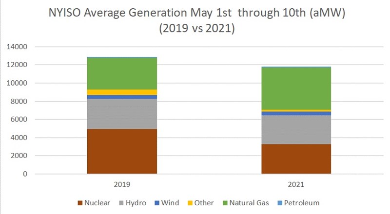 The bar on the left shows the generation mix on the New York grid for May 1-10 in 2019, when both units at Indian Point were still running, and the bar on the right shows the mix for the same period of 2021, after the final unit went offline on April 30. The picture is clear: the drop in nuclear generation, in brown, has been matched by an increase in gas-fired generation, in green. It is still very early days, of course, and New York plans to develop a lot more renewable energy. But the chart is a reminder that when nuclear capacity is lost, it is likely that higher-carbon generation will replace it.
