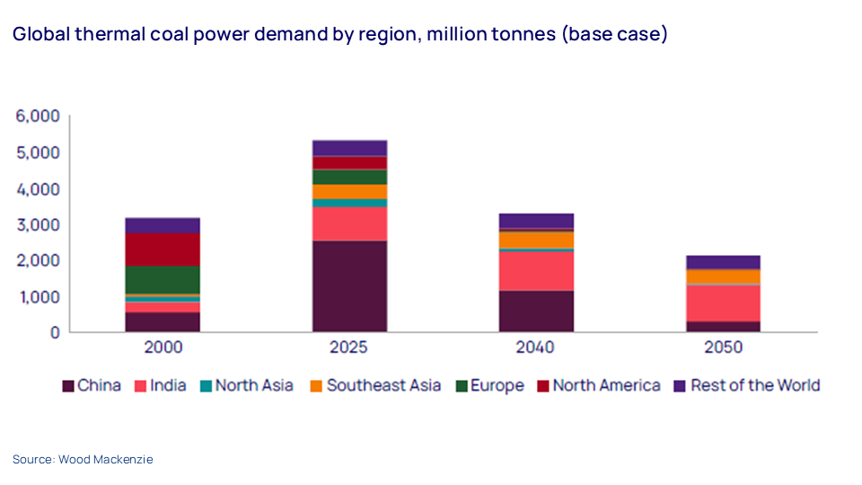This comes from our latest Horizons report: ‘Staying power – How new energy realities risk extending coal's sunset’, by Anthony Knutson and David Brown. It shows global coal demand, actual and projected, to 2050 in Wood Mackenzie's base case forecast. You can see how consumption is dominated by China (maroon) and India (pink). Asia as a whole accounts for about 78% of global coal use.