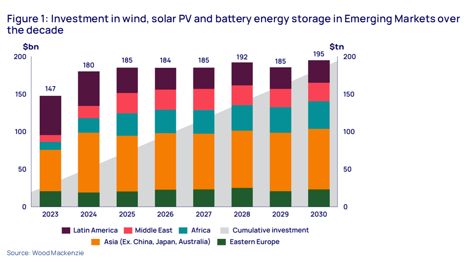The paper argues that emerging markets are well-positioned to leapfrog traditional fossil fuel-based energy systems and adopt cleaner, more sustainable alternatives, and Wood Mackenzie’s forecasts reflect that. The chart shows our projections for investment in wind, solar and battery storage in emerging markets out to the end of the decade. And as you can see, the numbers run in the range of US$180 billion to US$195 billion every year to 2030.