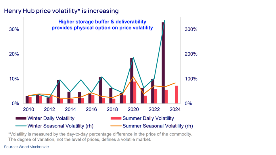 This comes from our new report on the winter outlook for natural gas in North America. It shows price volatility for the Henry Hub benchmark, which has been on a clear upward trend over the past decade. The increase in both daily and seasonal volatility in winter is particularly striking.