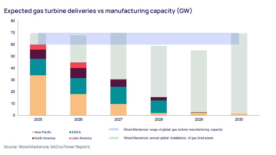 This chart comes from our latest analysis on the future of gas-fired power. We combined known orders with our preliminary gas-turbine forecast to total manufacturing capacity. Our expectations for manufacturing capacity are based on Wood Mackenzie’s latest analysis of the gas turbine value chain. We expect the gas turbine market to be very tight through 2030 with limited expansion to manufacturing capacity.