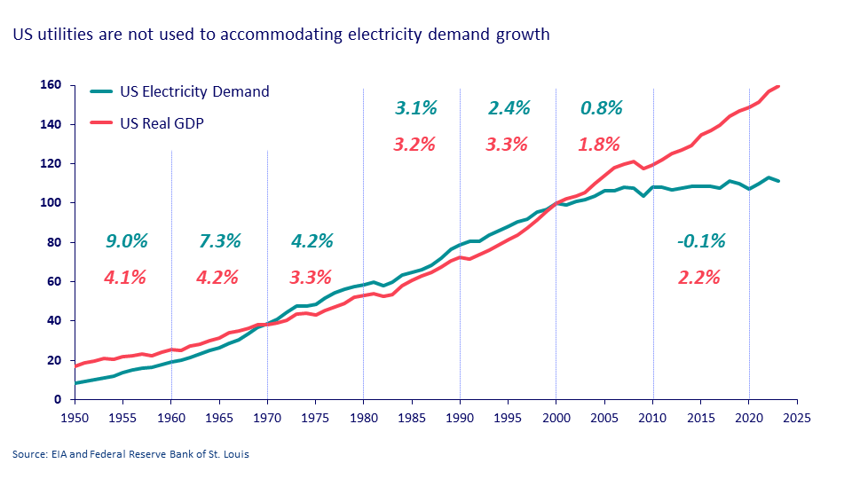 Since 2005 or so there has been very little growth in US electricity demand, even as the economy has continued to expand. With new demand coming for data centres, manufacturing facilities and the electrification of transport and heating, it looks as though that period of stagnation is coming to an end, which will mean unfamiliar market dynamics for many in the industry. Younger people now working in the US power industry have only known sluggish demand growth for their entire careers.