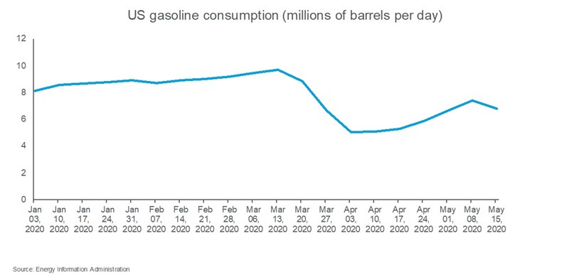 And as a result, gasoline demand has been picking up strongly. In the week to May 15, US gasoline consumption of 6.79 million barrels a day was up about 35% from its low point in early April, although it was still down 28% from its level of a year ago, according to the Energy Information Administration.