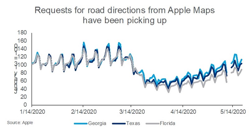 Despite the hammer blow to the economy, however, Americans are getting out and on to the roads again. Data on requests for directions from Apple Maps show that in Georgia, Texas and Florida, activity has been getting close to its levels in January.