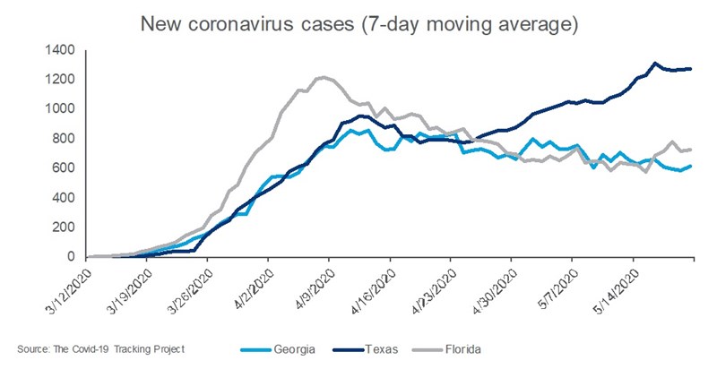 The good news is that the states that have been reopening have not shown any clear signs of a surge in infections. Georgia began easing its restrictions on businesses on April 24, Texas on May 1 and Florida on May 4, and cases have not started running out of control in any of them. Texas has recorded a steady rise in cases in May, but that appears to have been a result of a sharp increase in testing.