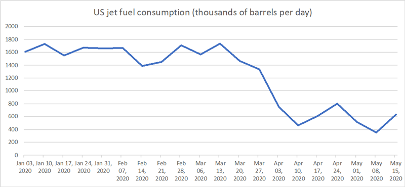 For jet fuel, meanwhile, the recovery has barely begun. US jet fuel consumption in the week to May 15 was down 59% from the equivalent week in 2019, the EIA data show.