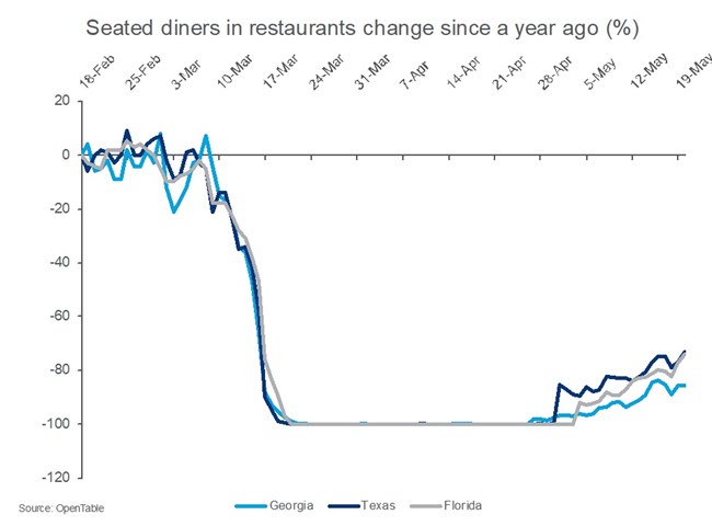 The less good news is that the number of new coronavirus cases may be remaining subdued because life in the reopening states is still far from normal. Many people are still being careful, and many businesses such as restaurants still face restrictions. Data from a sample of 20,000 restaurants using OpenTable, the online booking service, show that the number of people dining out in Georgia, Texas and Florida this week was down 73%-89% from its levels of a year ago.