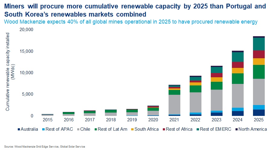 This comes from a report we published last month, on mining companies’ procurement of renewable energy. A global transition towards lower-carbon energy will need significantly increased production of some metals, while at the same time mining companies are under pressure to reduce costs and cut their own greenhouse gas emissions. The result is that the use of renewable energy in the mining industry is likely to grow rapidly. By 2025, 40% of all mines operational worldwide are expected to have procured at least some renewable energy, with Chile, Australia and South Africa the biggest markets.
