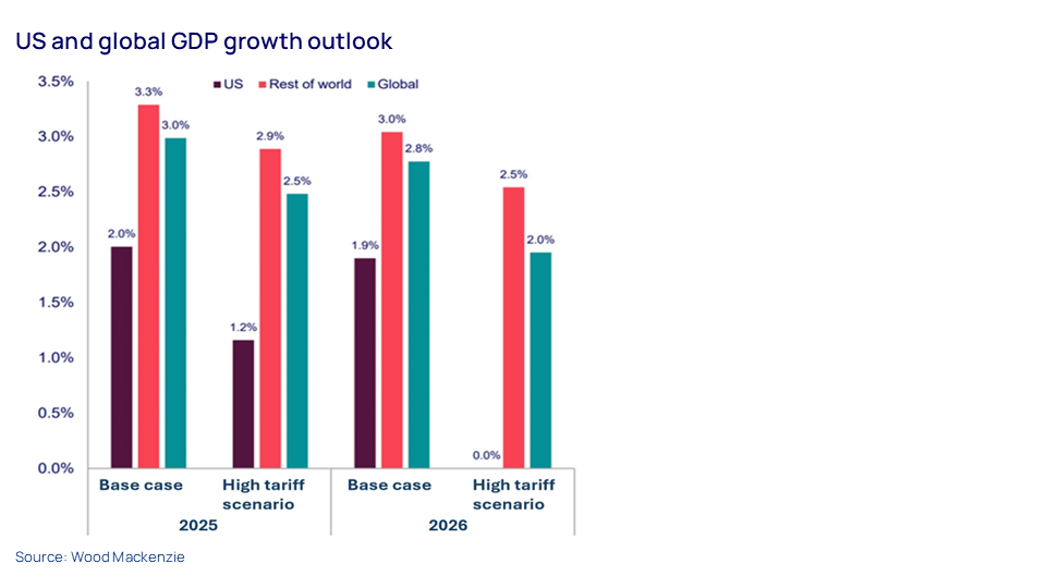 This shows US and international growth rates in two projections for 2025 and 2026, published by Wood Mackenzie’s head of economics Peter Martin last year. It compares our base case forecast with the high tariff scenario described above. If the new tariffs announced by President Trump last week remain in place, and China and the EU follow through with their threatened retaliation, our new base case will be closer to that high tariff scenario.