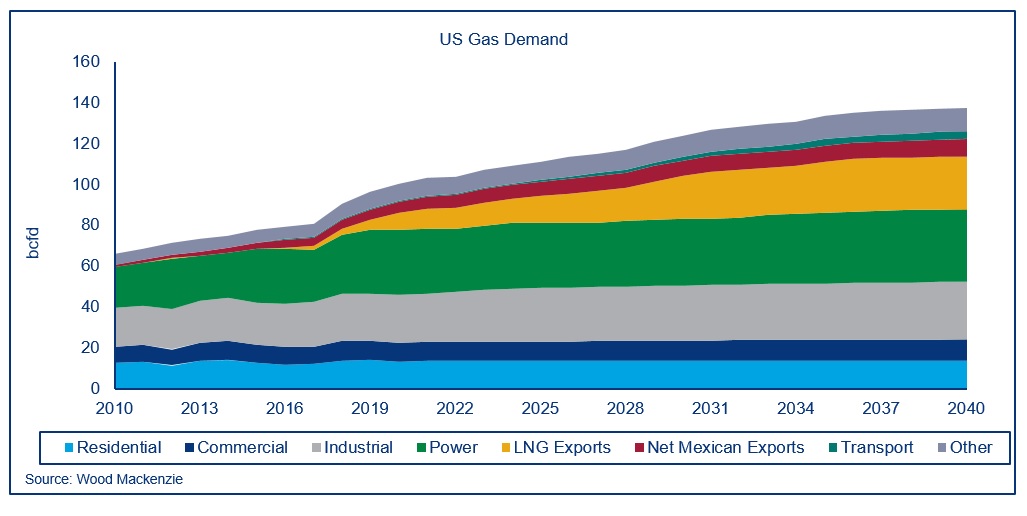 Beyond any policy debates, however, the gas industry’s strongest defence is the slow turnover of the housing stock. Globally, two-thirds of the building area that is in use today is expected to be still in use in 2050. Wood Mackenzie’s forecasts for US gas demand do not show much of an impact from electrification: residential consumption is expected to be the same in 2040 as it was in 2018. If the all-electric movement continues to gain momentum, however, that forecast could face downside risks.