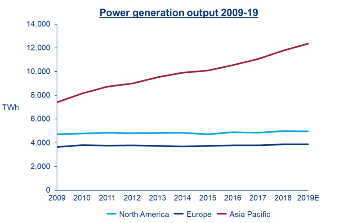 This comes from a recent report by Wood Mackenzie’s Alex Whitworth on power generation in the Asia-Pacific region. While generation has essentially flatlined in the US and the EU over the past decade, it has continued to soar in Asia. This year or next, electricity demand in the Asia-Pacific region is expected to exceed half the worldwide total. Most of the growth in generation has come from established sources: 80% of the increase has been in coal, gas, nuclear and hydro power. A critical question for the coming decade will be how far wind and solar power can continue to increase their market share and slow the growth of coal- and gas-fired plants.