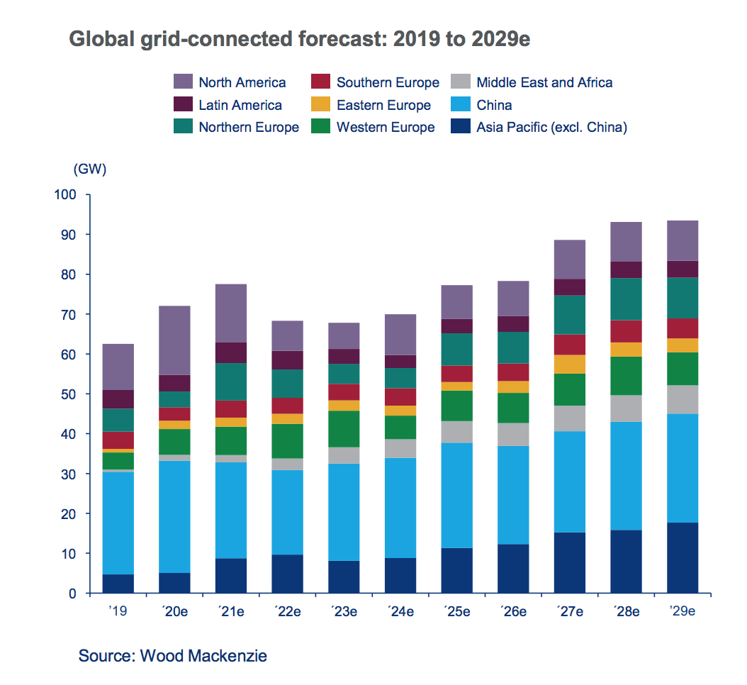 This chart, from Wood Mackenzie’s latest global wind power market update, shows expected installations of wind capacity worldwide out to 2029. Although the Covid-19 pandemic is still raging, our analysts have actually raised their prediction for future installations by 2% since the last forecast three months ago. The pandemic has hit expected wind investment in India, but in China and the rest of the Asia-Pacific region, prospects for developments have improved. China remains by far the largest single national market for wind turbines, and over the coming decade it is expected to be the largest for offshore installations.