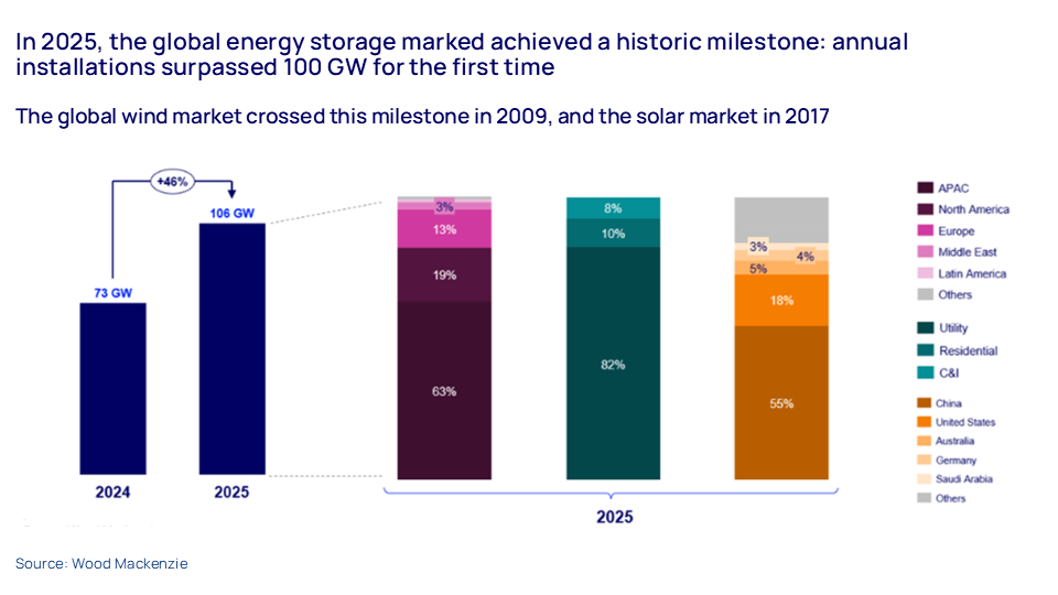 This is a graphic from Wood Mackenzie’s storage analysts Anna Darmani and Allison Weis, showing global installations of new energy storage capacity last year. The numbers are remarkable. Total installations were 46% higher last year than in 2024, with 55% of that capacity added in China, almost three times as much as in the US.